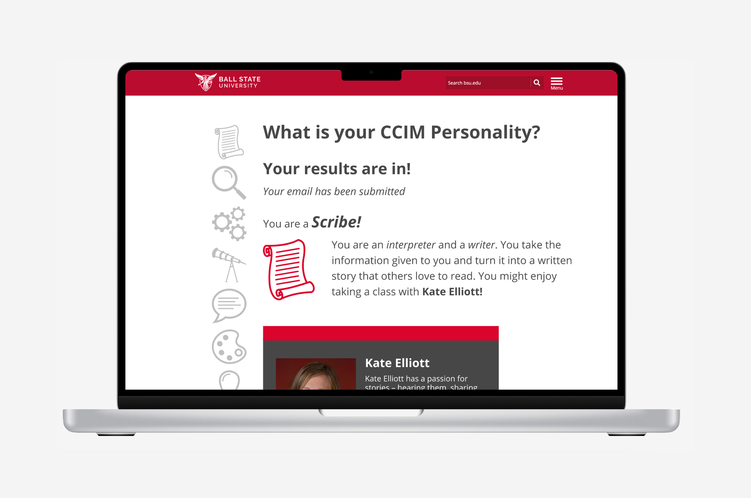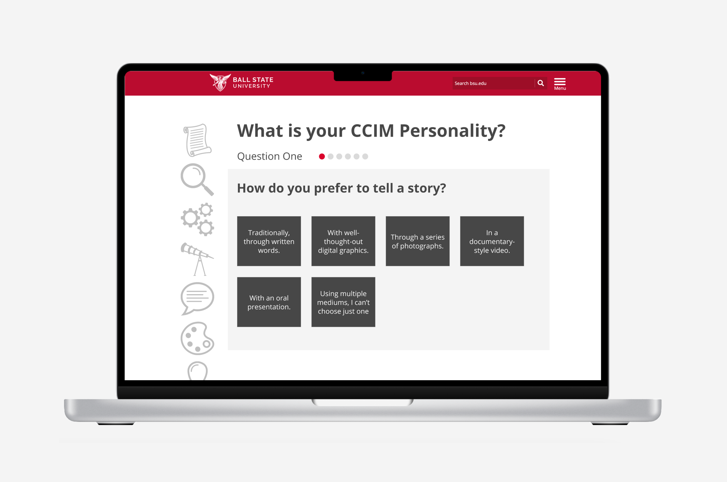 The College of Communication, Information, and Media (CCIM) requested a website to engage prospective students and introduce them to CCIM and its professors at Ball State University. The Digital Corps' communication, development, and design teams collaborated to create the "What Is Your CCIM Personality?" quiz.