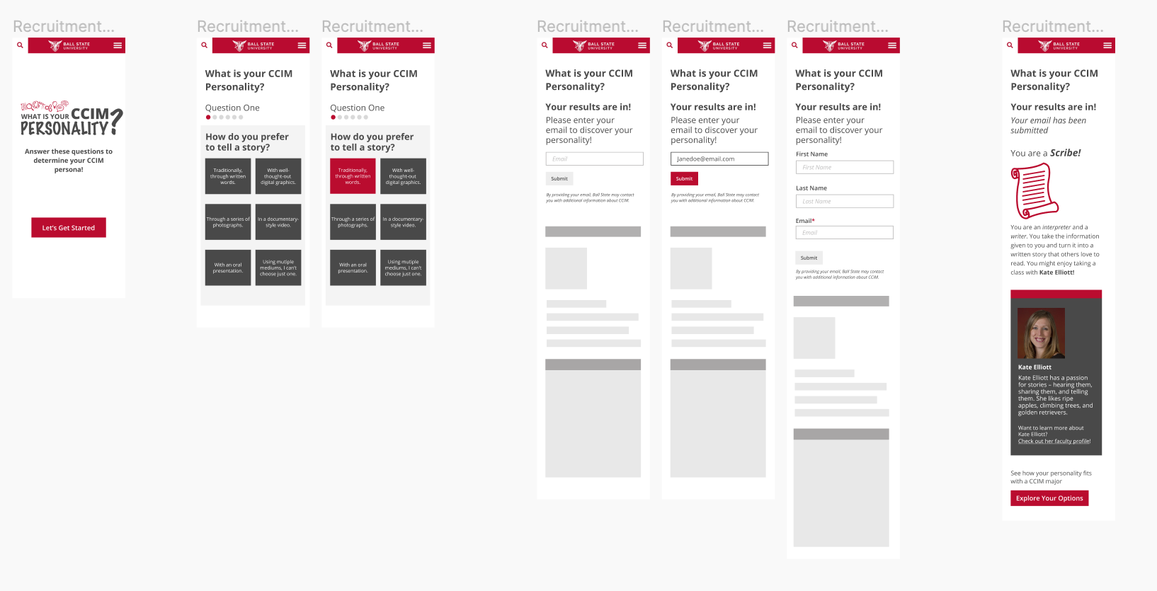 The goal was to create a website quiz that would engage and educate prospective students about the CCIM department. My role involved taking the copy provided by the communication team and organizing it into a visually appealing layout. I created eight illustrations to represent the different quiz results: Scribe, Observer, Crafter, Visionary, Architect, Strategizer, Bard, and Harmonizer. I then incorporated these illustrations into the high-fidelity wireframes and prototyped the quiz interactions, which the development team used to build the final site.