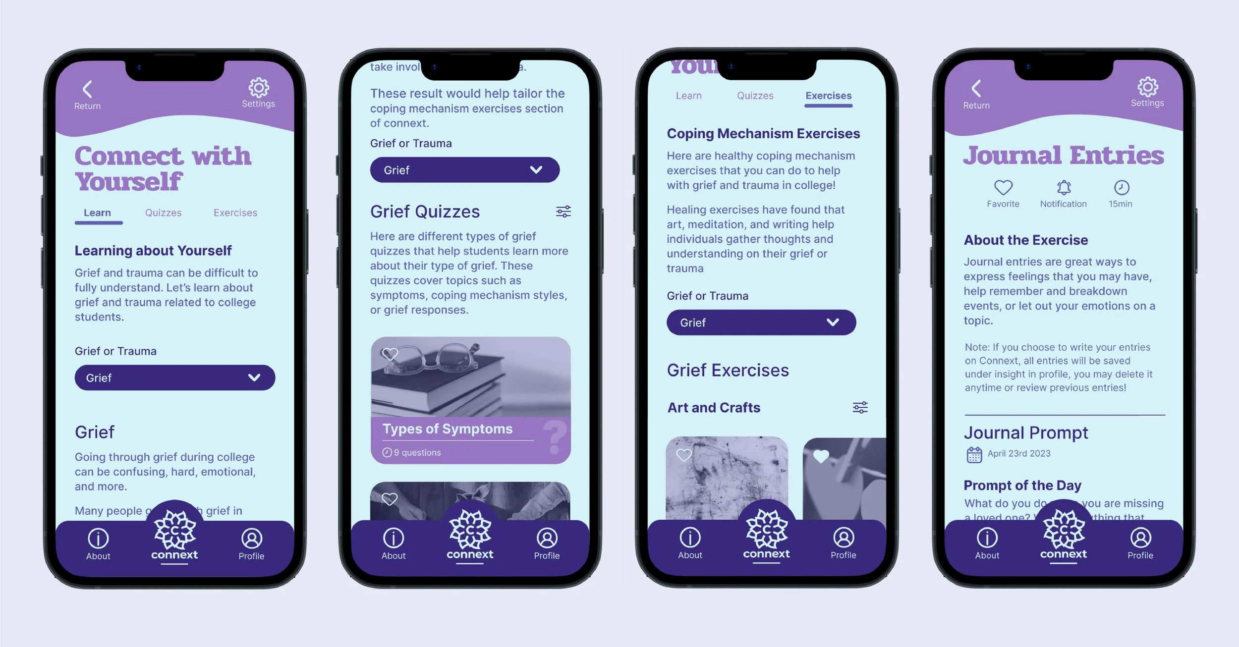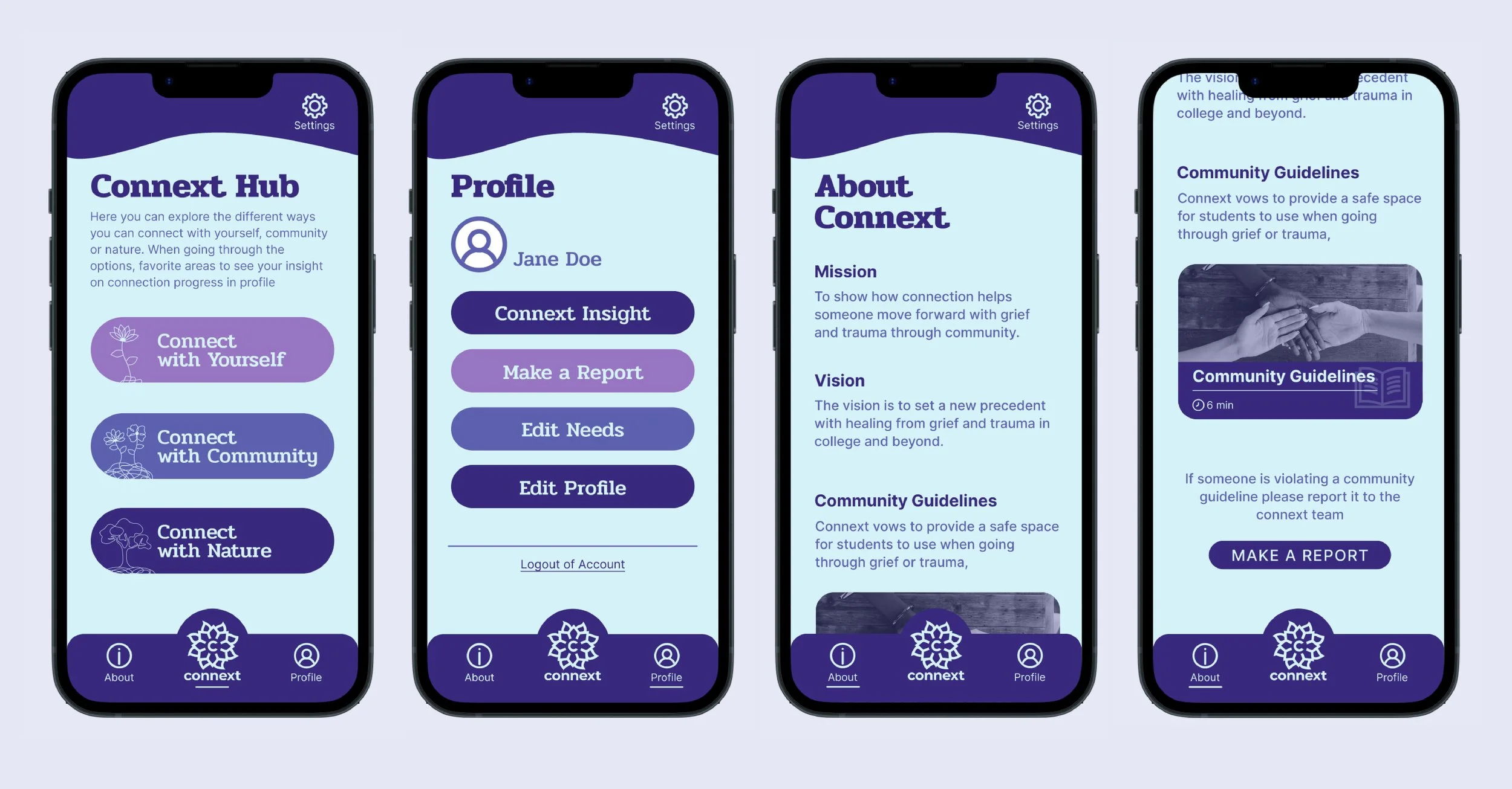 Connext is an organization dedicated to supporting college students as they navigate grief and trauma during their time in school. The Connext campaign includes a comprehensive brand style guide, app design, print collateral, and a targeted social media campaign.
