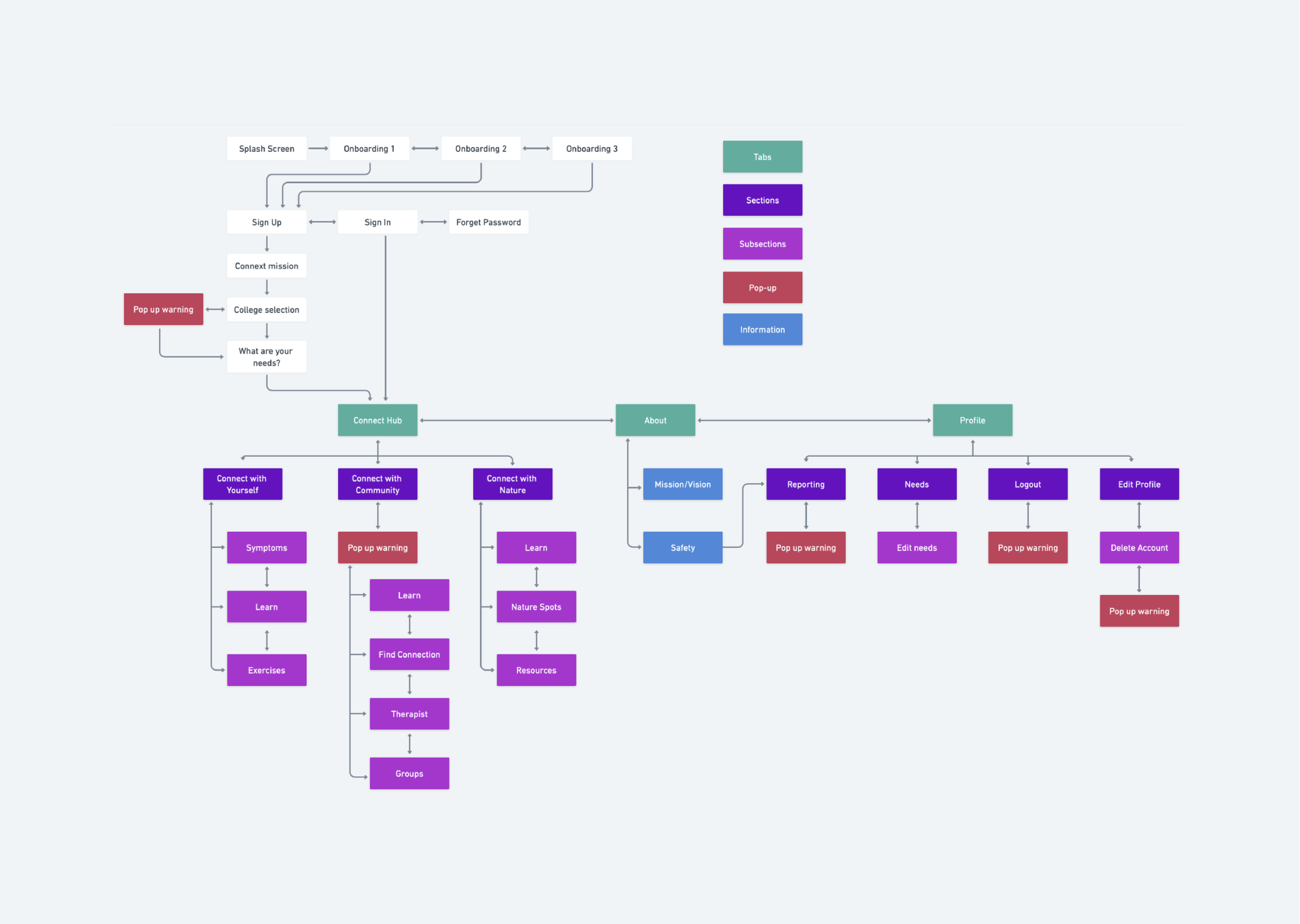 The Connext app is designed for a seamless user experience, allowing users to customize their settings and update them at any time. The app features a central hub for the three connection forms, enabling users to easily navigate to their preferred section. The information architecture established the app's organizational flow, utilizing nesting and tabs for smooth navigation. The low-fidelity wireframes helped outline the layout and user interactions, which guided the development of UI elements in the high-fidelity wireframes.