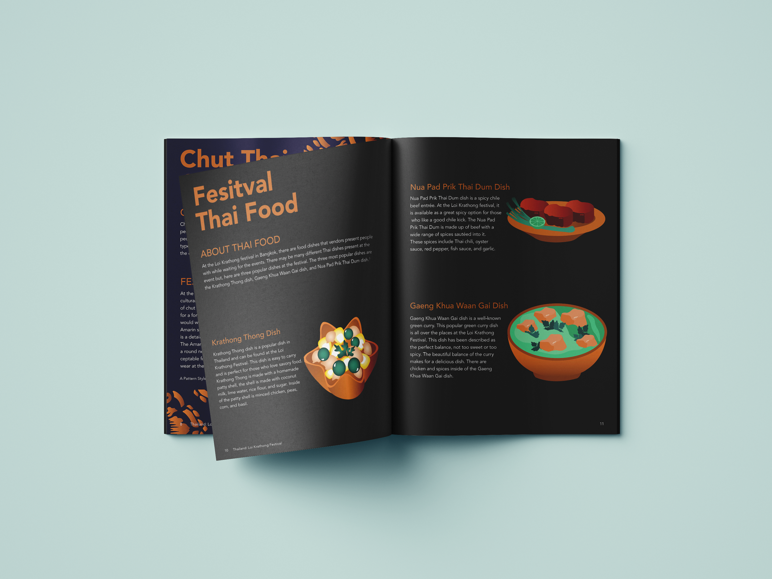 The Thailand: Loi Krathong Festival is a cultural booklet designed for those looking to attend and prepare for the festival. This 12-page booklet showcases the festival’s clothing, food, and origins through engaging illustrations and detailed writing.